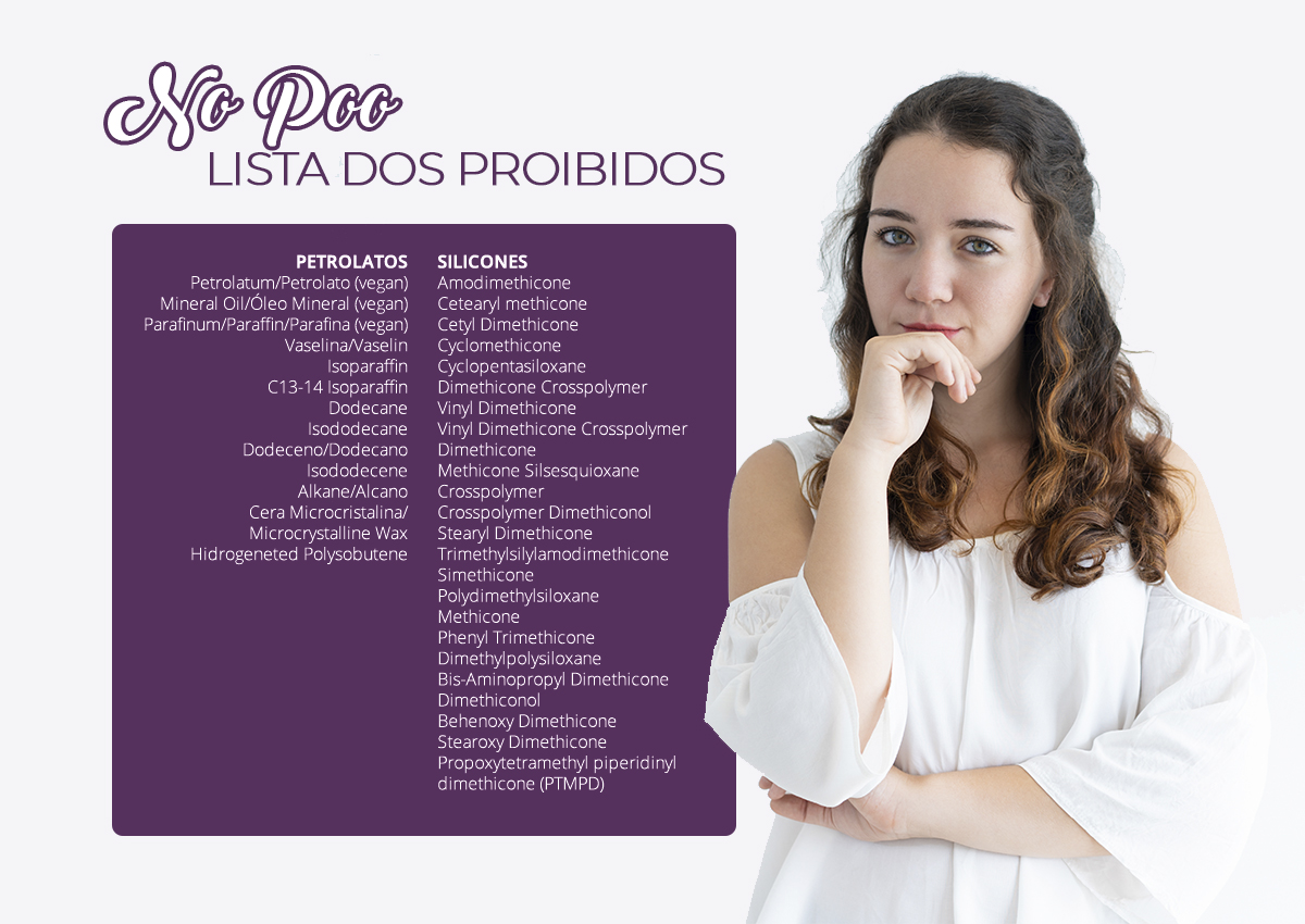 O No Poo (ou, em tradução livre, “sem shampoo”) é uma rotina de cuidado capilar que visa a exclusão do uso de shampoos e/ou detergentes com surfactantes (leia-se SULFATOS, de qualquer tipo). Nesta técnica, a limpeza dos fios é feita somente com produtos cremosos e com poder condicionante. Mas, ATENÇÃO: não pode ser feita com qualquer condicionador: os ideais e permitidos são, em geral, mais leves e livres de petrolatos e silicones de qualquer tipo (solúveis ou não).
